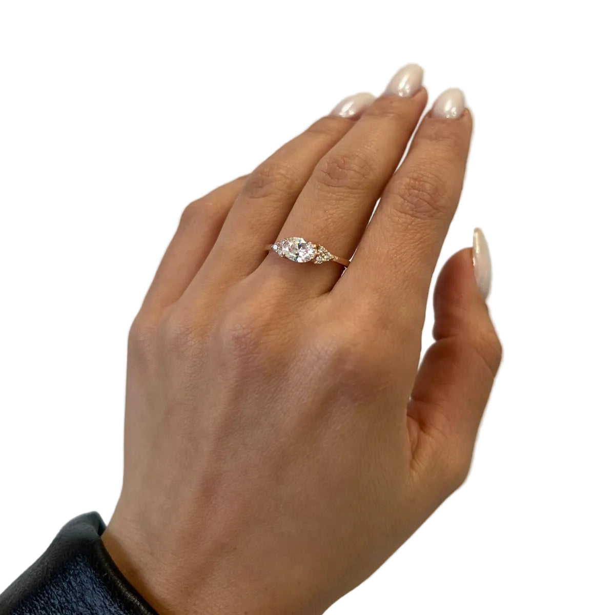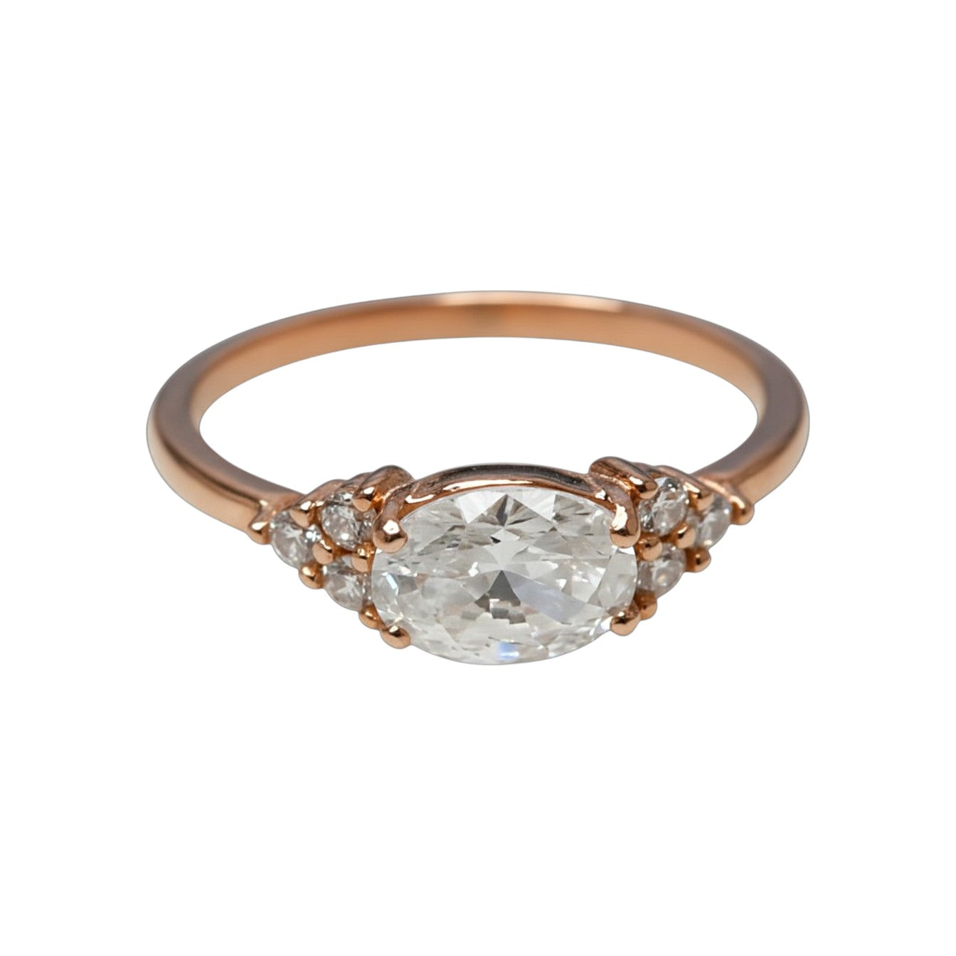 טבעת מזהב אדום 14 קראט משובצת זרקון מרכזי אובלי בולט ושלושה זרקונים שקופים בצדדים.