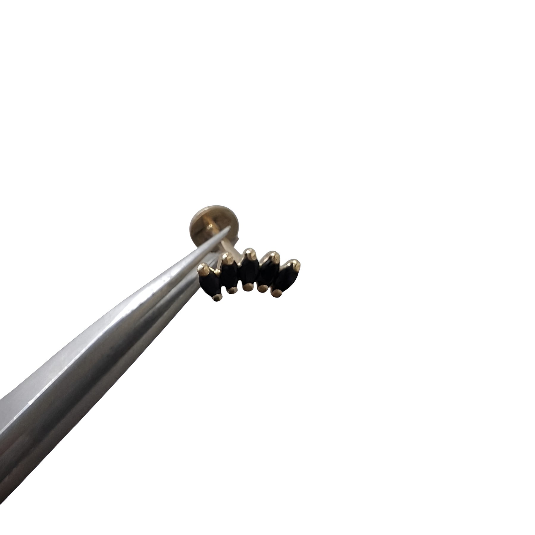 עגיל זהב צהוב 14 קראט בודד הליקס/טרגוס/לברט בעיצוב מניפה עם 5 זרקונים שחורים בצורת מרקיזה.