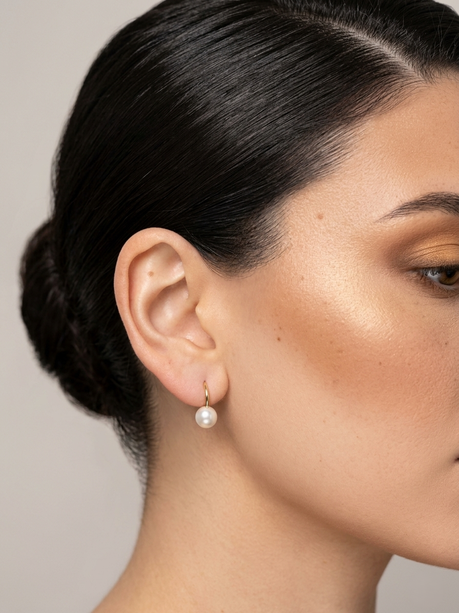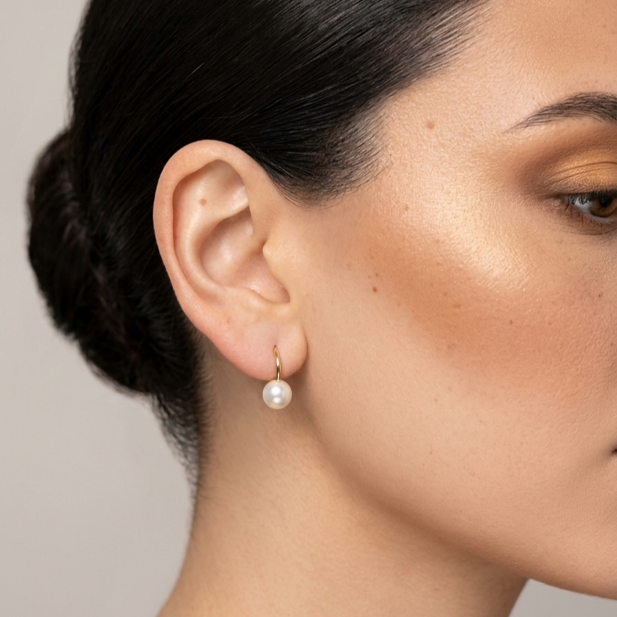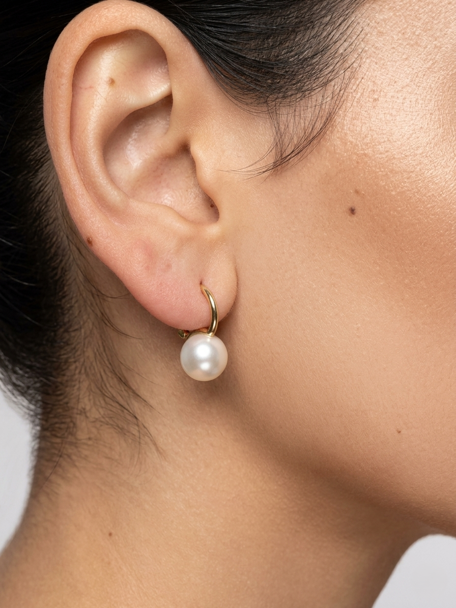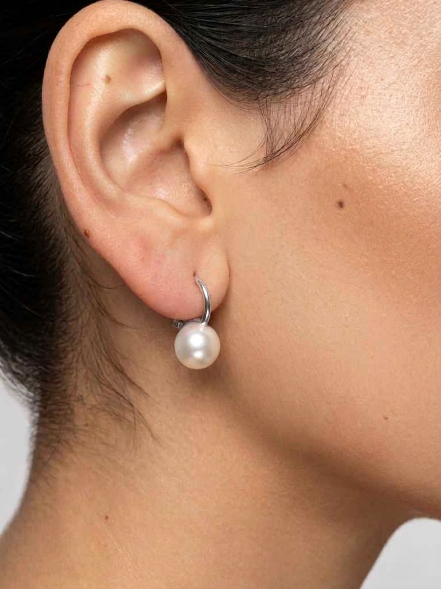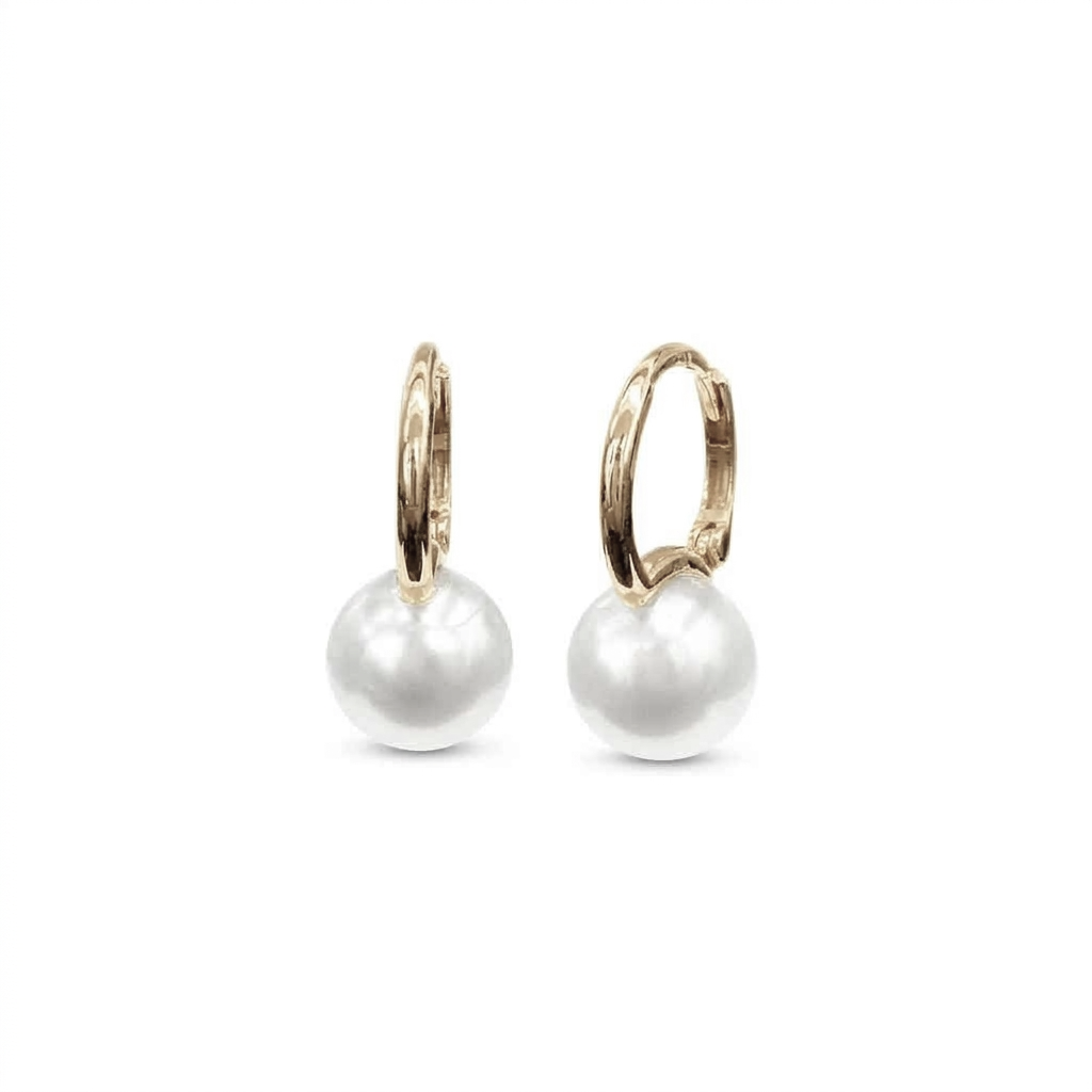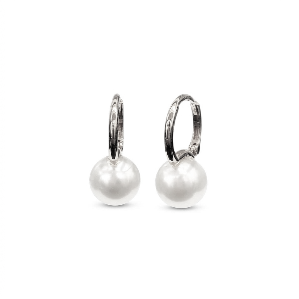 עגילי חישוק זהב לבן 14 קראט עם פנינה.