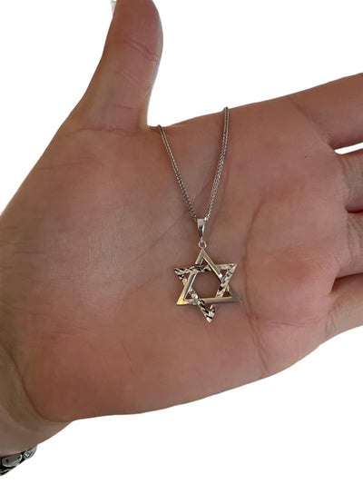 שרשרת זהב לבן 14 קרט עם תליון מגן דוד גדול משולב עם חיתוכי לייזר, מתאימה לשני המינים.