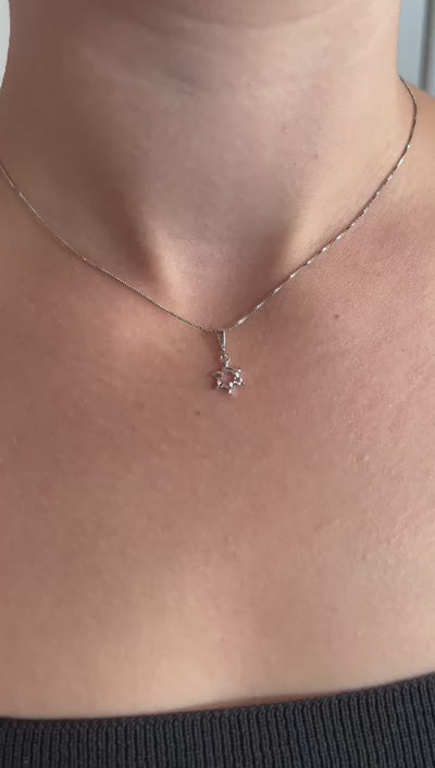 שרשרת זהב לבן 14 קרט עם תליון מגן דוד קטן עם חיתוכי לייזר.